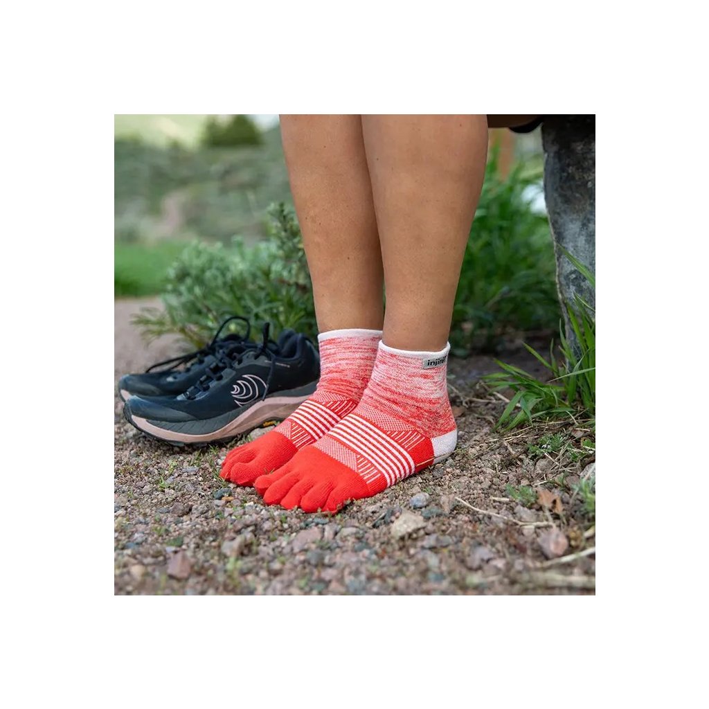 Navrhnuté pre ženy, ktoré behajú a rýchlo sa pohybujú v nerovnom teréne, Trail Midweight Mini-Crew prstové ponožky poskytujú pohodlie, ochranu a podporu. Dvojitý lem vo výške Mini-Crew bráni prenikaniu nečistôt a prachu, zatiaľ čo vlákna COOLMAX® EcoMade odvádzajú vlhkosť. Stredne hrubé polstrovanie v oblasti chodidla a podpora klenby zaisťujú komfort pri trailových behoch, zatiaľ čo jedinečný päťprstový dizajn minimalizuje pľuzgiere a umožňuje plné zapojenie chodidla aj na úzkych chodníkoch.