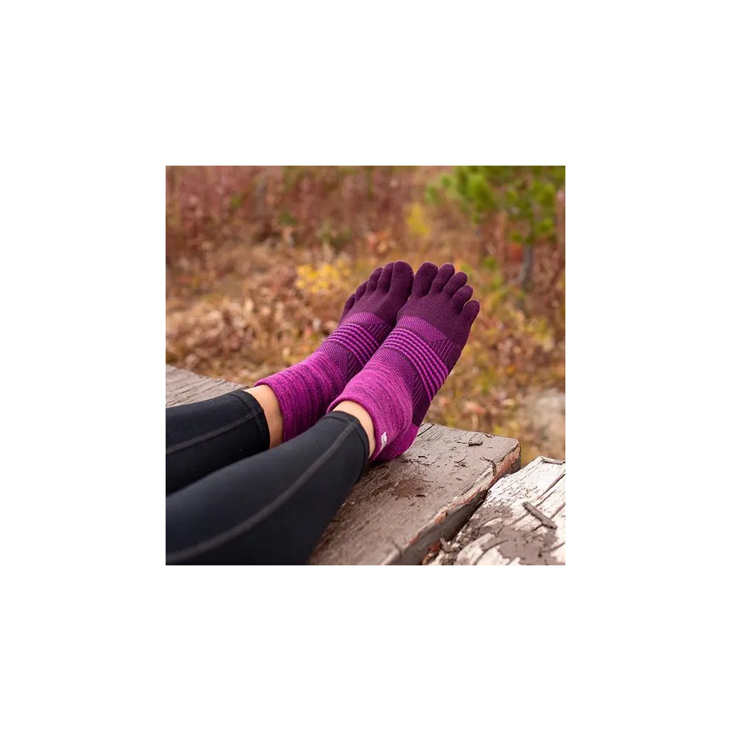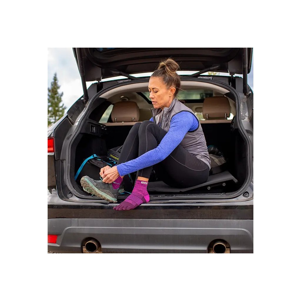 Navrhnuté pre ženy, ktoré behajú a rýchlo sa pohybujú v nerovnom teréne, Trail Midweight Mini-Crew prstové ponožky poskytujú pohodlie, ochranu a podporu. Dvojitý lem vo výške Mini-Crew bráni prenikaniu nečistôt a prachu, zatiaľ čo vlákna COOLMAX® EcoMade odvádzajú vlhkosť. Stredne hrubé polstrovanie v oblasti chodidla a podpora klenby zaisťujú komfort pri trailových behoch, zatiaľ čo jedinečný päťprstový dizajn minimalizuje pľuzgiere a umožňuje plné zapojenie chodidla aj na úzkych chodníkoch.