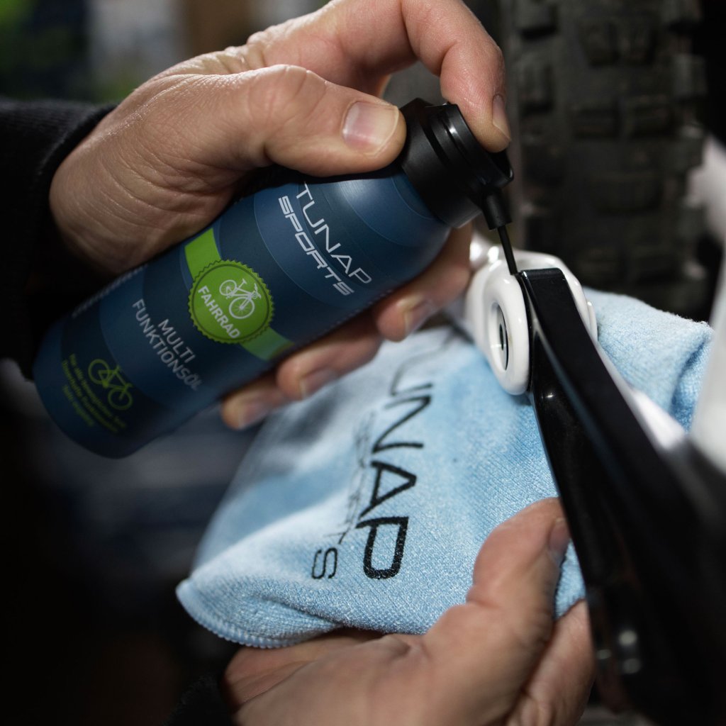 Náš univerzálny pomocník patrí do každého batohu. TUNAP SPORTS multifunkčný olej je zároveň čistič, ochrana proti korózii, odstraňovač hrdze, mazivo a kontaktný sprej. Jeho zloženie je šetrné k povrchom rámu, tesneniam, plastom aj gume a obsahuje aditíva, ktoré preniknú aj do tých najjemnejších medzier. Multifunkčný olej pomáha pri údržbe pohyblivých komponentov bicykla – odstraňuje ľahkú povrchovú hrdzu, maže ložiská a kĺby tlmičov, je ideálny po každej oprave, údržbe alebo umytí bicykla. Je tiež výborne vhodný pre e-biky, pretože chráni kontakty elektronických častí pred koróziou a zabraňuje zbytočným odporom, ktoré môžu spôsobovať zvýšenie teploty a stratu kapacity.